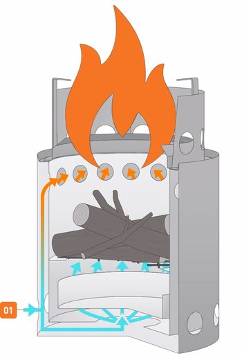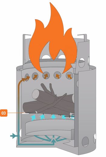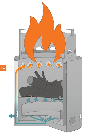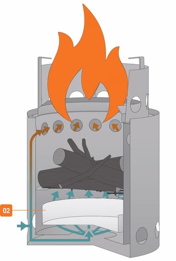 Otvory poblíž horní části vnitřního pláště proudí do prostoru spalování předehřátý vzduch a podporuje tak hoření, což má za následek tvorbu plamenů o vyšší teplotě a dokonalejší spalování s menším podílem kouře.